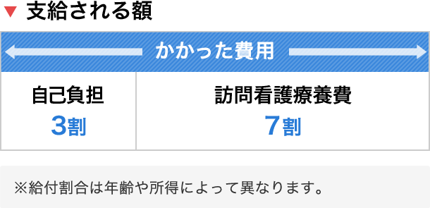 在宅において継続して療養を受ける状態にある人(難病患者等で医師が厚生労働省の基準により認めた人)が、安心して家庭で療養できるように、指定訪問看護事業者の訪問看護・介護サービスを受けたとき、かかった費用の3割を自己負担すればよいことになっています。残りの7割は、訪問看護療養費として支給されます。