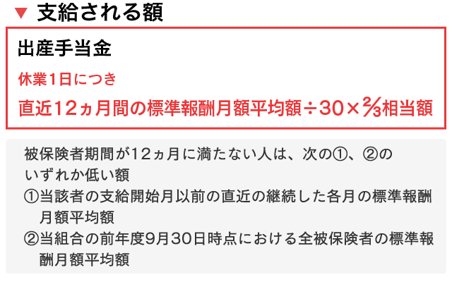 女性被保険者が出産したときには、出産のため仕事を休んでいた期間の生活費の一部として休業1日につき直近12ヵ月間の標準報酬月額平均額÷30×2/3相当額が支給されます。これを「出産手当金」といいます。