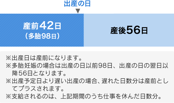 - ※産前産後休業期間:産前42日(多胎98日)、産後56日のうち、妊娠または出産を理由として労務に従事しなかった期間