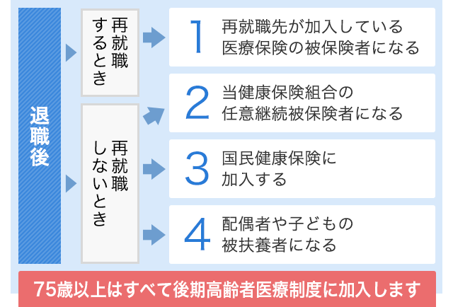 退職後は健康保険組合の資格を失い、その後はそれぞれの状況に応じた医療保険に加入することになります。