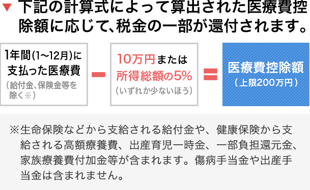医療費控除とは、みなさんのご家族の分も含めて、1年間に支払った医療費が基準額を超えるとき、税務署に確定申告することにより、その超過支払い分の医療費が課税対象の所得から控除され、税金の一部が還付される制度です。